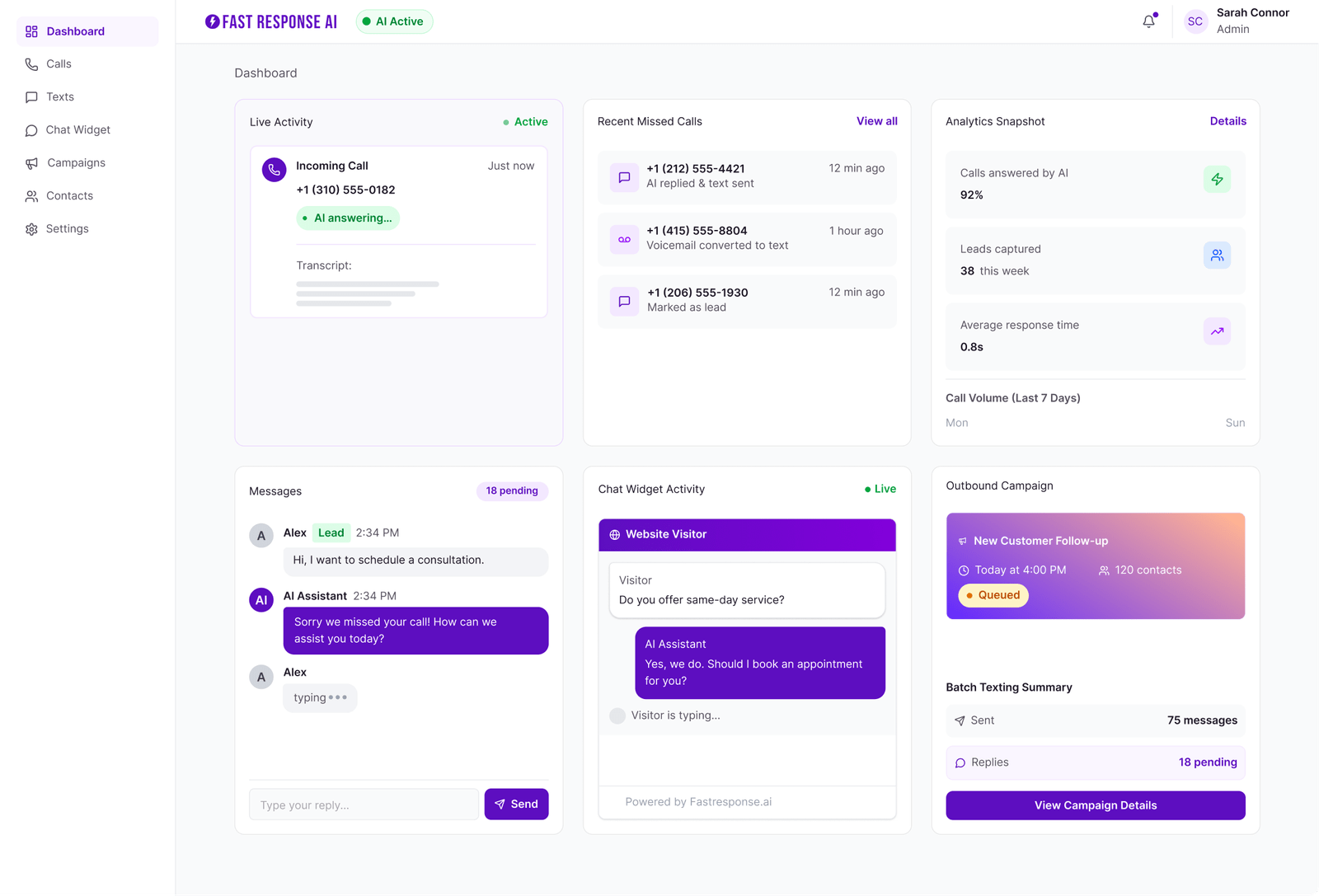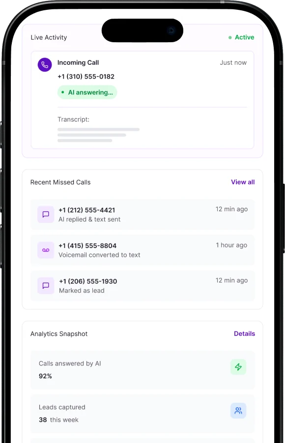 AI handles the calls or chats you can’t take. Our app gives you visibility anytime and allows you to jump in if you want.Â