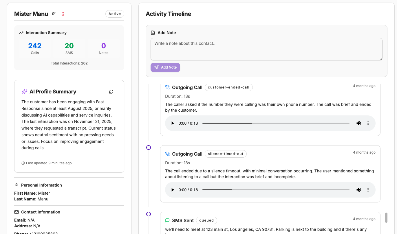 Calls, Texts, Chats and notes are all logged under each of your contacts, building up the usable knowledge for our AI to become more efficient overtime.Â